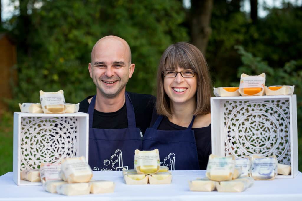Die kleine Schaumfabrik ist immer wieder auf Reisen und lässt sich bei verschiedenen Kunsthandwerksmärkten nieder. So kommen die Fabriksdirektoren an die frische Luft und die feinen Seifchen unters Volk.